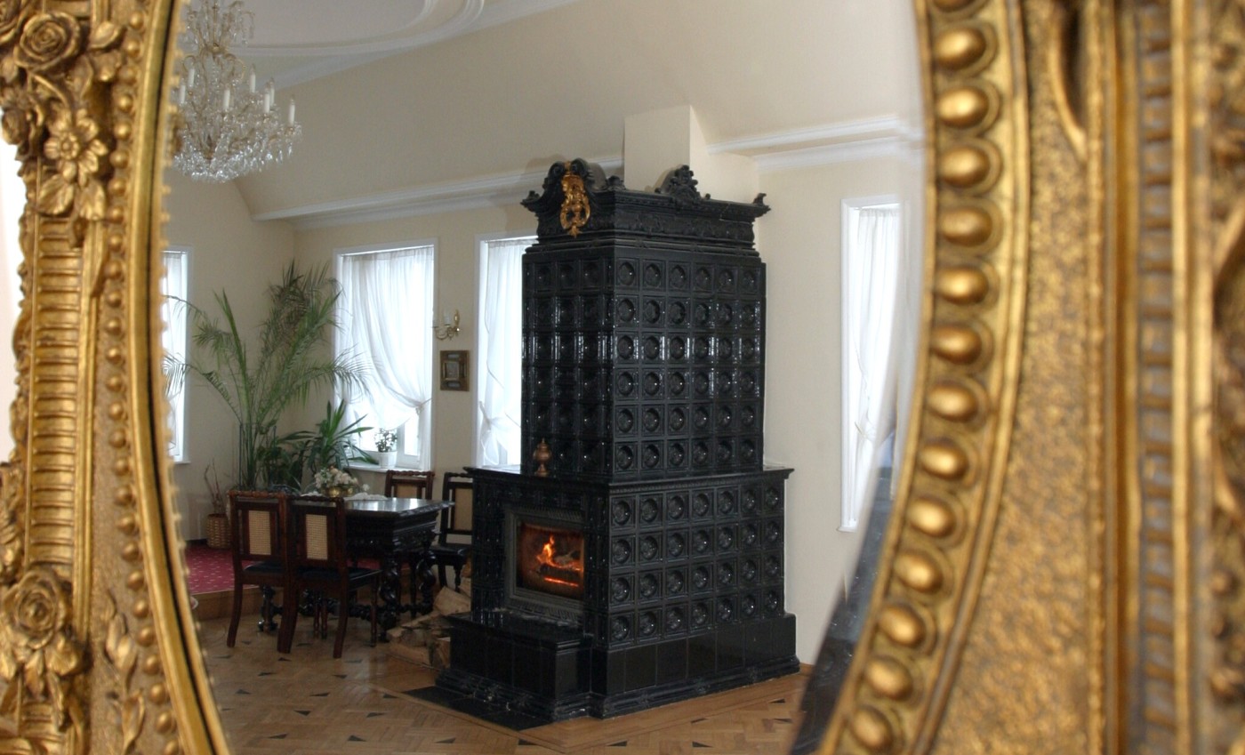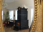 - Czarny kaflowy piec z kominkiem w stylu renesansowym